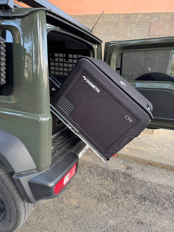 Opcionalmente, la bandeja deslizante inclinable de nevera se puede ampliar con una caja adicional. Gracias a esta solución, al extraer el refrigerador, los artículos no caen en el espacio donde se insertó. Esto permite usar la nevera fácilmente, incluso con el maletero completamente lleno. El sistema se atornilla a la bandeja, lo que crea un conjunto uniforme y evita la necesidad de taladrar agujeros adicionales en el sistema de cajones ni en el propio todoterreno. Fabricado a medida, permite un uso óptimo del espacio.
