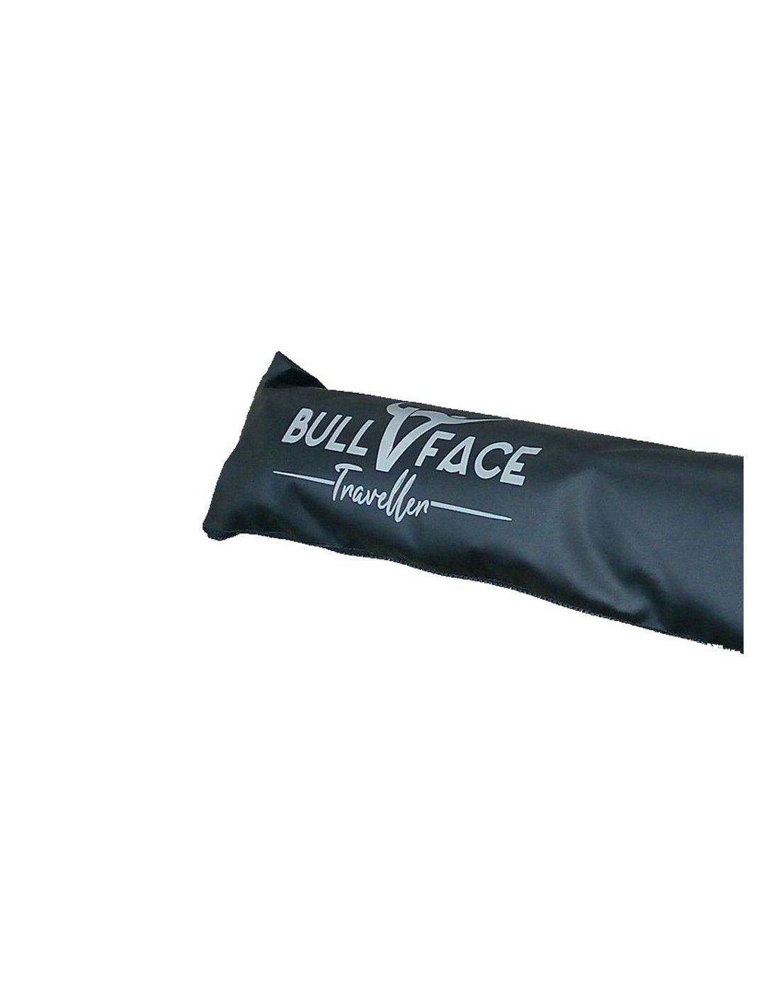 El toldo se recoge en un funda de PVC con cremallera, color negro y con logotipo «Bullface Traveller» estampado.