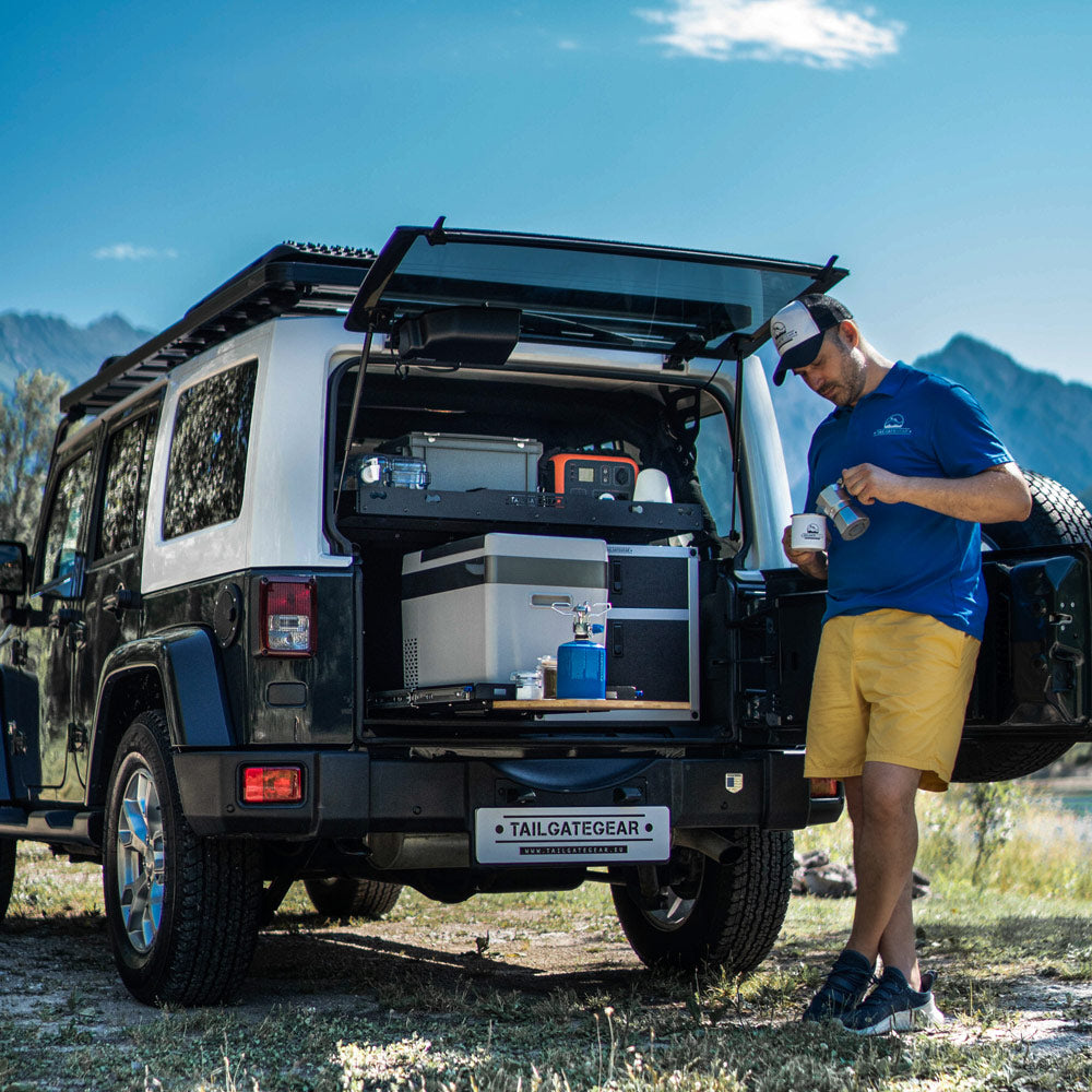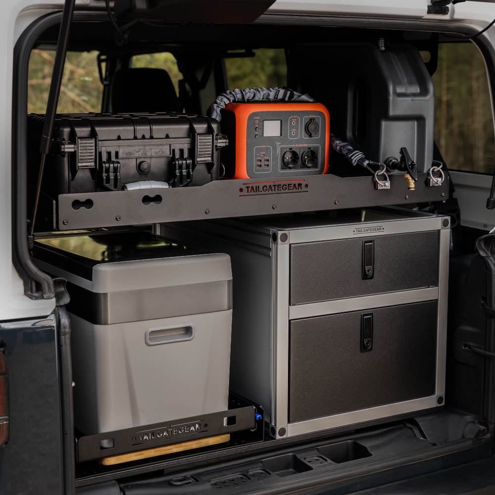 Versatilidad: La corredera para refrigerador y carga, y el cajón doble apilable, se pueden mover a izquierda y derecha según la posición que prefieras. El estante de carga de aluminio se puede subir o bajar según el equipo que lleves y el espacio que necesites asignar a cada artículo. Además, la parte inferior del estante de carga, así como la parte delantera y trasera, se pueden usar para guardar equipo adicional: un hacha, un extintor, una pala y más.